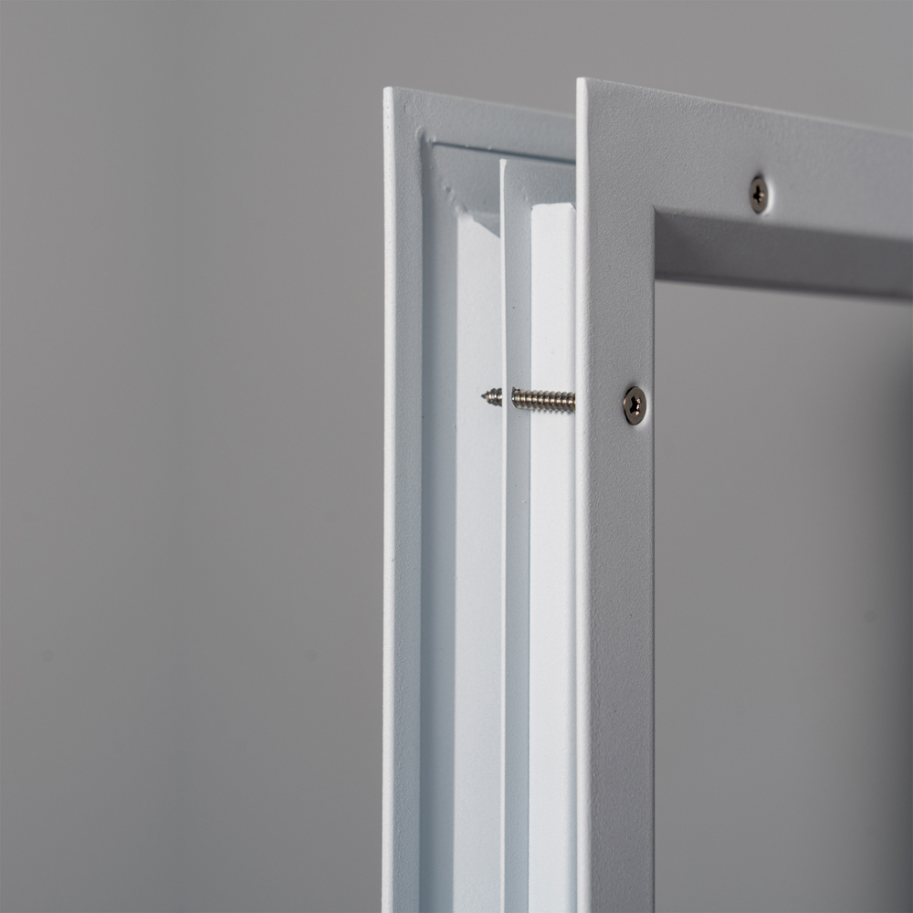 Self attaching style. Uses sheet metal screws that pass through the door cutout, and fasten to the opposite side of the Panel.